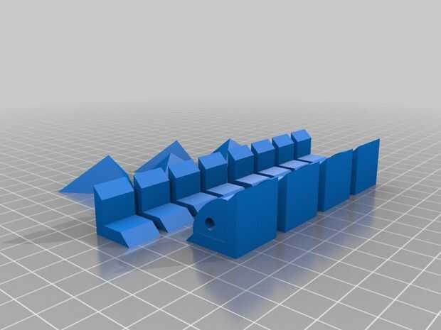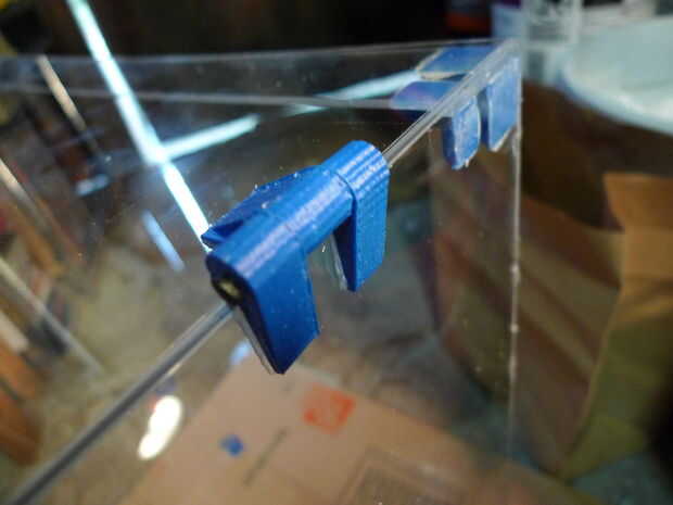 Estas son las bisagras de la puerta al recinto. El pasador de la bisagra se cuelga de es una sección del filamento de 3,0 mm ABS que tiene fines "martillado" con un elemento caliente, como un soldador. Usted puede limpiar hacia fuera los agujeros de la bisagra con un 1/8" pedacito de taladro que solo es un poquito mayor que 3,0 mm.