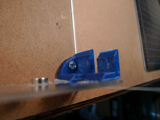 Para empezar, debe pegar en las pirámides de 3 lados en las esquinas superiores y los "pies" con los orificios en las esquinas inferiores. Tenga en cuenta, en este punto en la Asamblea de la caja invertida, las esquinas superiores hacia abajo y las esquinas inferiores son para arriba. En un extremo de la caja, los soportes se pegan a los 2 soportes de pulgada de ancho que se colocan dentro de la puerta. Otros soportes se pueden utilizar para unir las hojas a lo largo de los bordes. Sólo utilicé un soporte extra en cada borde y 2 soportes de llevará a cabo las abrazaderas firmemente en cada extremo.