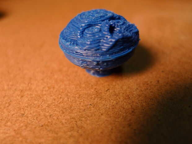 Perilla de cráneo La puerta en el recinto necesita un mando, y, porque formas orgánicas como cráneos parecen impresionantes 3D impresión, tomé un modelo 3D de un cráneo, picado y lo aplastado y pegado en un pomo. Hay un agujero en la parte inferior por un tornillo, pero una gota pequeña de inicio soldador plástico Devcon corresponde la tarea de pegar firmemente hacia el frente, así que ningunos agujeros deben taladrarse; no deben ocurrir grietas.