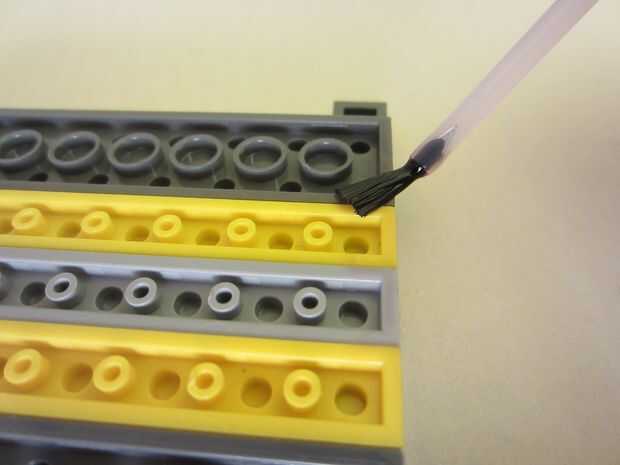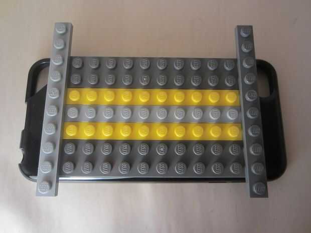 Cepillo/Aplique pegamento en la parte inferior de los LEGOs, con el fin de conectar los ladrillos. Después de esa capa de pegamento se haya secado, aplique otra capa de pegamento y pegarlo firmemente a su caso. Asegúrese de que esté alineada. Espere que seque y retirar sus apoyo LEGOs.