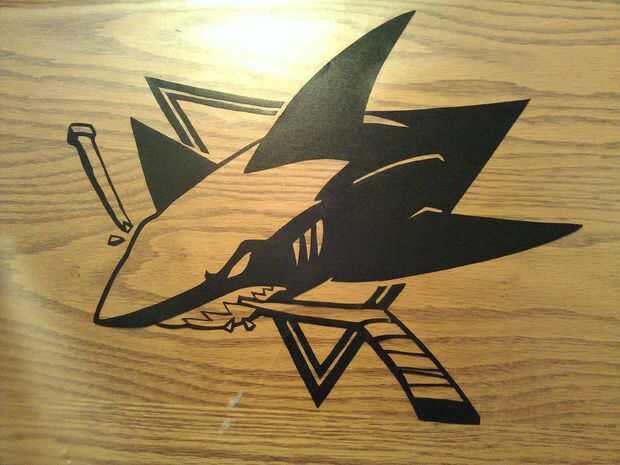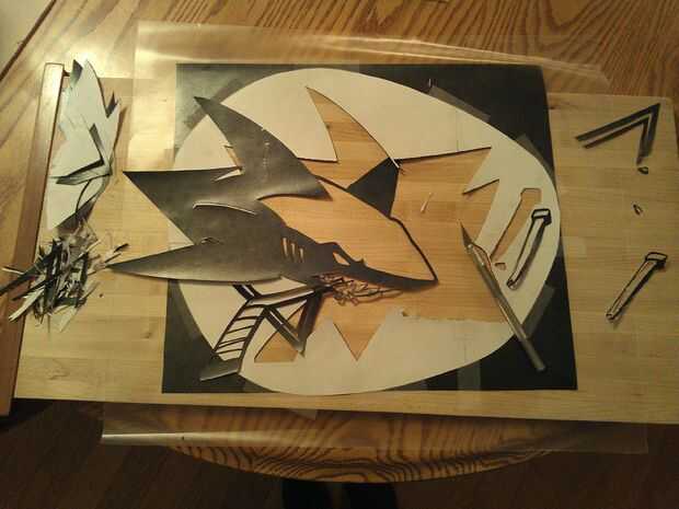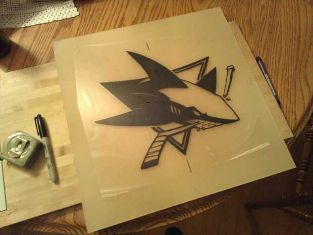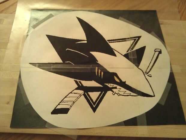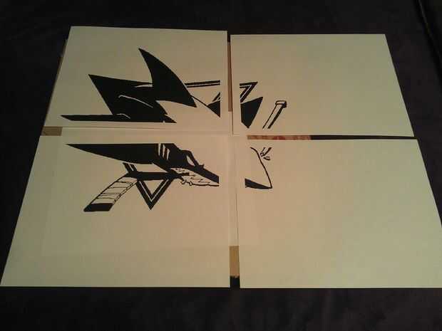 Agarré una imagen en blanco y negro en línea. También puede tomar una imagen a color del logo y usar pintura de microsoft para guardar como mapa de bits monocromo. Imprima su insignia. Si es grande, corte y cinta juntos como lo hice aquí. Puede utilizar Adobe para imprimir "posters" y quitar el borde blanco para ahorrarle tiempo.
