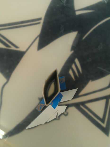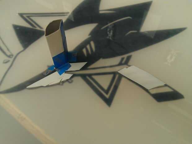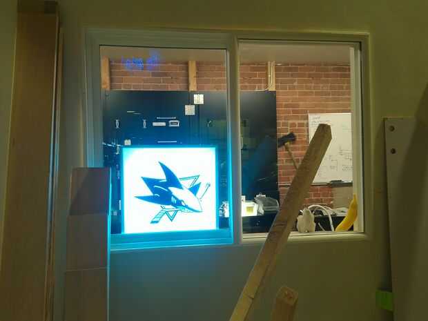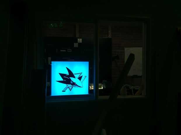 Para obtener un mejor efecto, usé cartón y había hecha un embudo por la luz naranja. De esta forma que se enciende solamente el ojo del tiburón. También usé cinta aislante blanca para la cinta de la boca y palo de hockey. Esto le da un aspecto blanco más puro, ya que normalmente no se colorea en el logo.