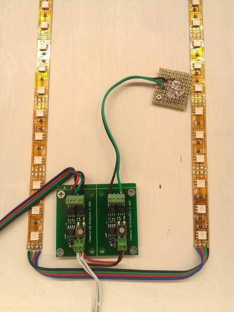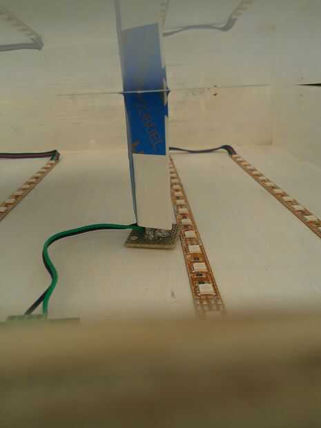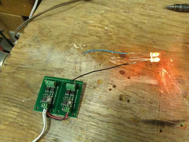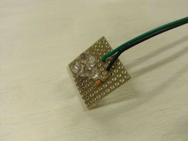 Utiliza LEDs naranja de un controlador y ajuste el regulador a un modo de lento efecto estroboscópico. Primero prueba las luces, luego montados en un pedazo de tablero de perf. Puesto que estos controladores son 12V en la salida, me encontré tres LEDs y una resistencia de 330 Ohm en serie a través de una de las salidas RGB. El otro controlador se establece en un sólido verde azulado, con la luz de tira RGB led conectada normalmente.