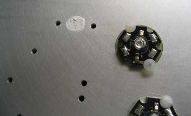 Poner grasa de calor en ambos lados de la mica y emparedado entre el LED y el aluminio. Conecte los LEDs con los tornillos de nylon.