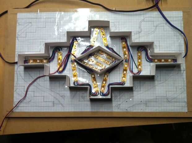 Me gusto mucho Instructable Ex Machina sonido reactivos pared de Dan Chen LED. Era tan fácil de seguir, y los resultados fueron grandes. He creado la versión utilizando cartón y papel vitela, como se puede ver en la imagen con el LED rojo se ilumina