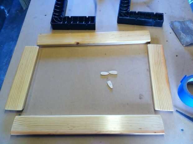 El tablero de abeto de Douglas de marcar y cortar cuatro lados del marco con ángulos de 45 grados a cada lado. Añadir una capa de poliuretano.
