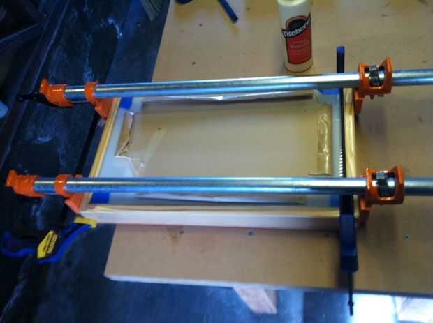utilicé un unidor de galletas para cortar muescas en cada lado de 45 grados. Añadí las galletas y pegamento a cada esquina. De su cola para arriba, asegure la pieza con pinzas para aproximadamente una hora antes de quitar las pinzas.