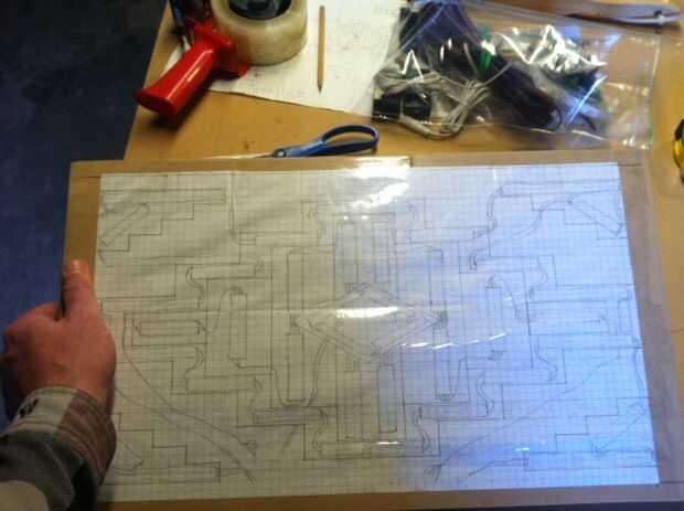 Toma tu hoja de MDF de 1/2" y ajuste a su tamaño en la Sierra de mesa. Tomé mi dibujo de escala completa y pegadas a la placa de soporte con cinta de embalaje transparente después de cortar el MDF a medida.