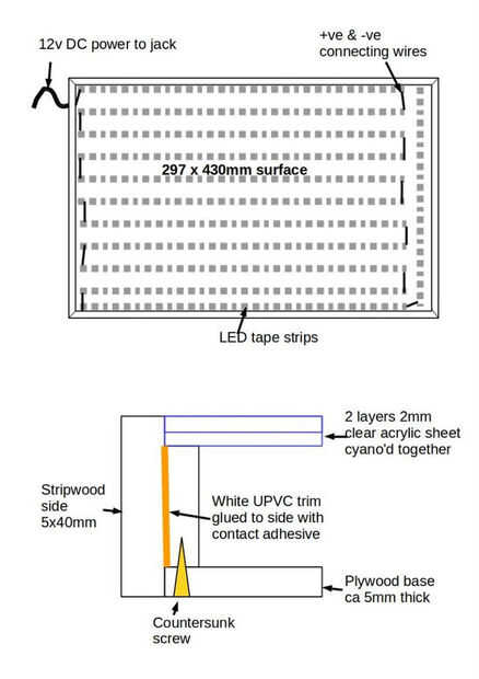 Un amigo fue limpiar su garaje y salieron con una modesta hoja de acrílico de 2mm y unas tiras de madera de varios. Tenía madera contrachapada de la chapa en stock - la base de vino de madera que había sido la parte trasera de un viejo aparador. Tablero de aglomerado (Masonite?) habría hecho para la base y los lados podrían haber sido cortados de madera contrachapada. O madera gruesa, enrutada para hacer rebajas para la base y la parte superior pero quería evitar ese nivel de finura y lío pues no tengo un taller dedicado.