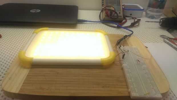 Es en este punto vale la pena probar la unidad así que conecte los cables hasta una fuente de alimentación de 5v para comprobar que los LEDs funcionan correctamente. He utilizado un cable USB que cortó el final y y un protoboard para hacer esto sin embargo puede utilizar otros materiales.