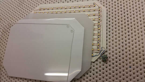 El panel frontal tiene tres capas que se sientan encima de un tablero de luz LED.