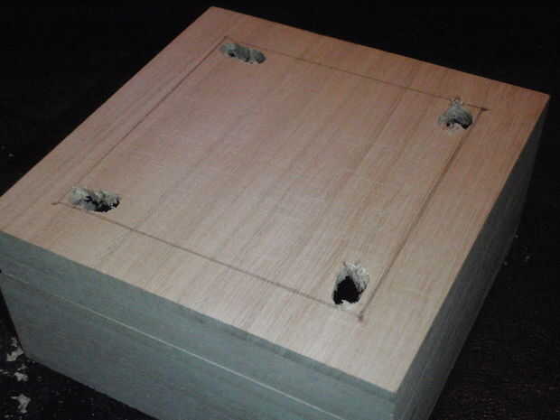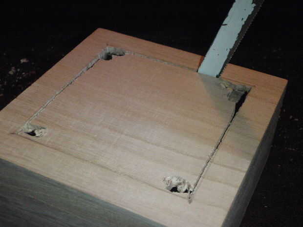 Así que marcó mis cortes con un lápiz luego utiliza un taladro y perforar algunos agujeros grandes para montar mi pequeño disco en. Tengo un hack vio cuchilla que usaba para esto, pero si tienes una plantilla VI sería mucho más rápido. Sea solo recortar la forma que quiere en la parte frontal de la caja, una vez cortado, no te olvides de hacer lijar un poco para asegurarse de que todo se ve bien!