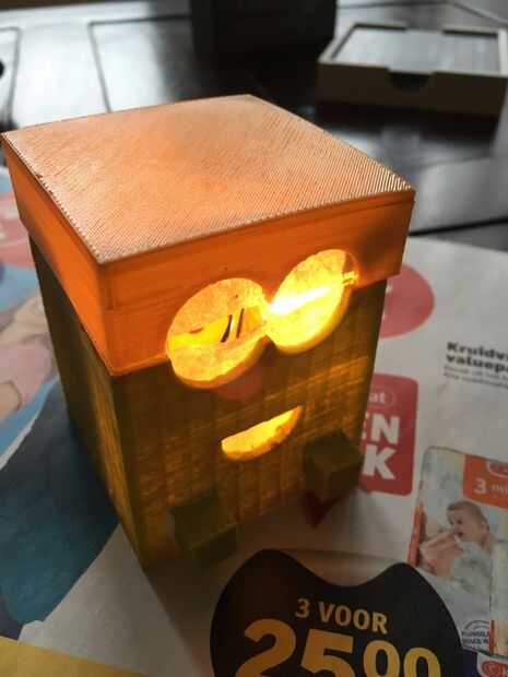 Estoy haciendo una pequeña caja que parece un poco a un súbdito. Insinde la caja allí es una luz, cada vez que cierras el cuadro de que la luz se encenderá. Los ojos y la boca del esbirro se ver a través de la caja en un poco de luz.
