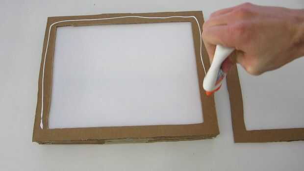 Tomar la primera capa y aplicar una mala delgada de pegamento alrededor del marco en la parte posterior. Luego pegar la segunda capa en la parte superior. Asegúrese de que las dos capas están correctamente alineadas. Luego aplicar pegamento a la parte posterior de la segunda capa. Repita este proceso hasta que todas las capas se apilan juntos. Como se indicó anteriormente, la capa trasera era solo una hoja fina de papel normal.