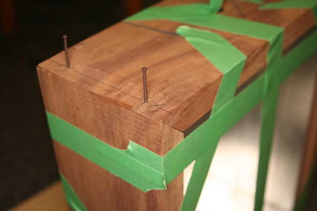 3) después de aproximadamente una hora, ponen clavos en las dos uniones encoladas. Taladré orificios pequeños para asegurarse de que yo no agrietar la madera.
