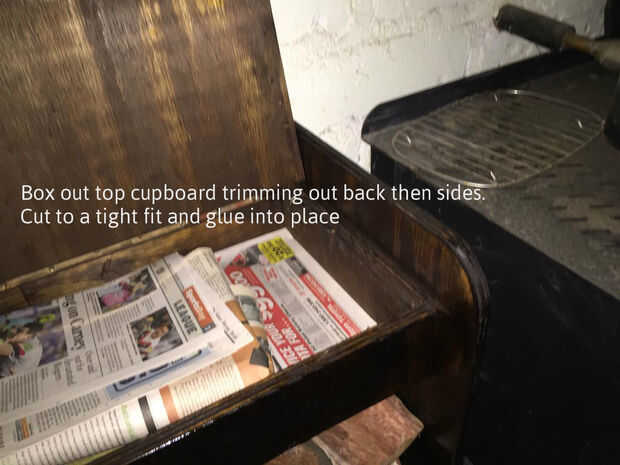 7. véase el cuadro. Mida y corte a 900mm hacia abajo para caber dentro de la parte posterior del armario. Esta medición después de la colocación se asegurarán de que es la altura correcta para encajar la tapa. Pegamento y clavo por detrás y por debajo de