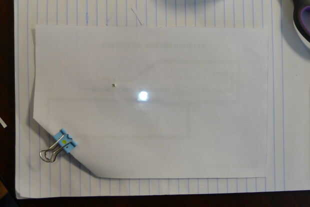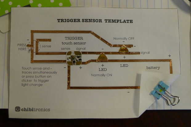 Para esta parte, las luces LED debe colocarse boca abajo. Pero antes de hacer esto, usted tendrá que cortar un agujero en el papel donde las luces sobresalga ligeramente hacia fuera. Ahora puede conectar el Sensor de disparo a la plantilla.