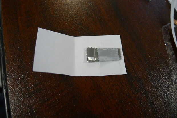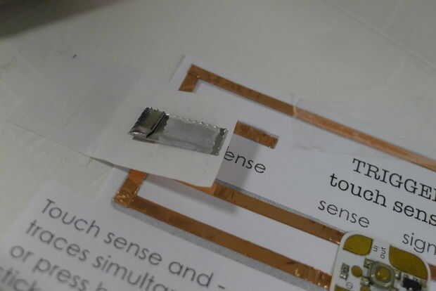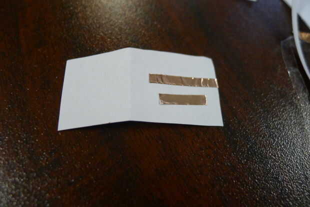 Tome el pequeño pedazo de papel y y dóblalo a la mitad. Un lado se pegará a la plantilla, al otro lado forma el interruptor. Ponga cinta de cobre en un lado del papel. Voltee el papel y poner la tapa de la botella magnética o cualquier otro elemento magnético en el otro lado como se muestra. Conecte al área circular indicada, asegurándose de que la hoja de cobre se alinea con la cinta de cobre en la plantilla. Pulse el interruptor para completar el circuito. Se trata de su interruptor magnético. Entonces, para probar los LEDs, acóplela al área indicada con el clip de la carpeta. Cuando usted presiona el interruptor, el LED deberá encenderse en el otro lado.