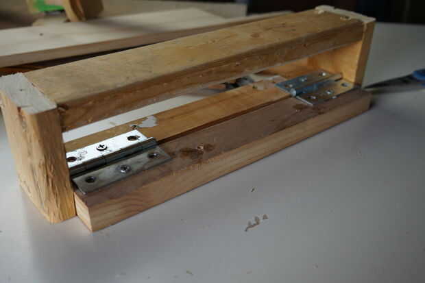 Lo primero es montar el mecanismo de la bisagra. Se trata de los dos pedazos más finos de madera. El proceso de colocar las bisagras va como esto: Coloque los pedazos de madera al lado del otro por lo que la parte más ancha quede hacia arriba. Para obtener la bisagra alineada en el centro - para que el centro de la articulación (ver: Terminología de bisagra) de la bisagra está en el centro de las dos piezas de madera; con aproximadamente una separación de 2 cm en el borde de los bloques. (ahora hacerlo para ambos)
