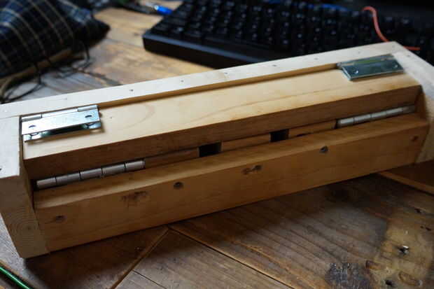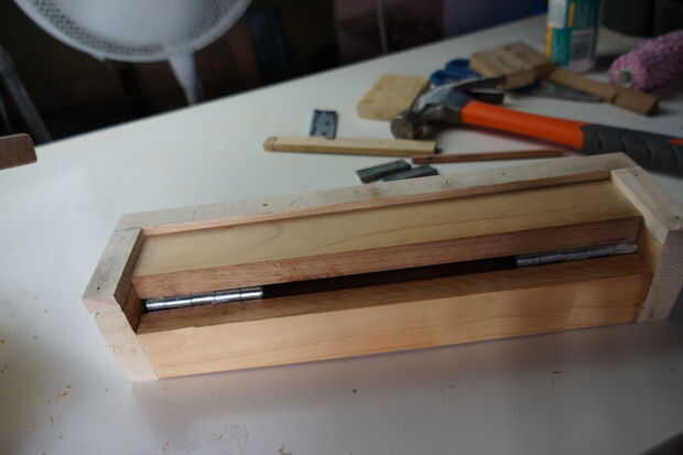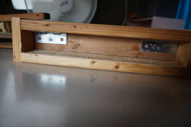 Originalmente iba a utilizar un mecanismo de cadena para dejar la caja caiga pero la caja fue cortada tan firmemente y precisa que el cuadro se sostiene bastante bien sin él. Estoy seguro de que con el tiempo va conseguir más y más flojo y luego añadirá un mecanismo de cadena simple con tornillos para sostenerlo para arriba.