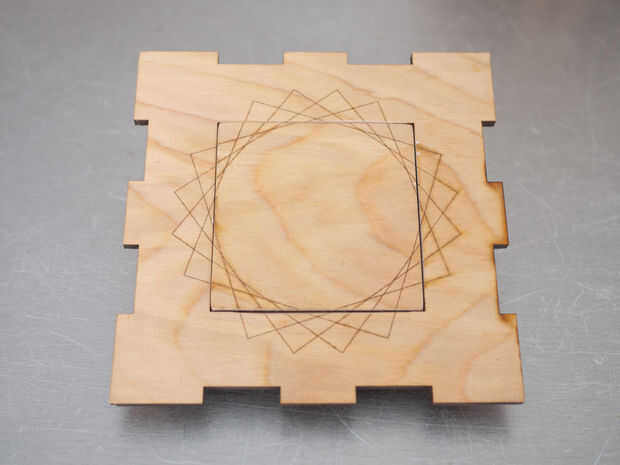 Todas estas piezas fueron cortadas con un cortador láser. Además de los cortes, usé el cortador del laser para corte en alguna cinta de enmascarar que había puesto encima de la madera. Desprendiendo las partes positivas de la imagen, pude crear una plantilla que podría utilizar para aplicar los diseños con la pintura negra de aerosol.