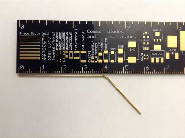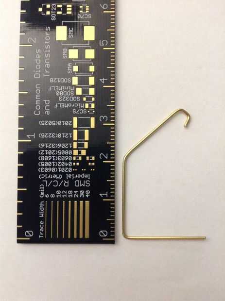 Luego, realizar un 90 grados (halfway-ish) unos 21 mm entre la curva que hizo originalmente y el extremo que está más lejos de la curva. En el extremo del extremo de ángulo de 45 grados del alambre, hacer un pequeño gancho con un par de pinzas (o algo similar). Una vez más, la curva de 90 grados no es super importante; nos a realmente ser doblarla más después para que permanece unido al cuerno del servo, pero esperaremos hasta entonces para hacerlo. Si deseas foto 2 (junto a dulce de Adafruit regla PCB) tener una referencia visual de cómo el alambre debe luego.