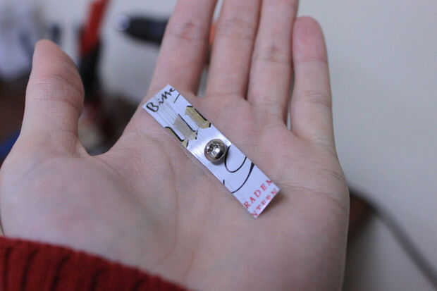 Corte una tira de una cerveza puede en 2'' de largo y 1/2 '' de ancho. Raspar y lijar hacia abajo. La tira también servirá como un elemento conductor del circuito. Utilice un tornillo de metal de hoja corta y penetrar en la franja. Hacer este paso dos veces.