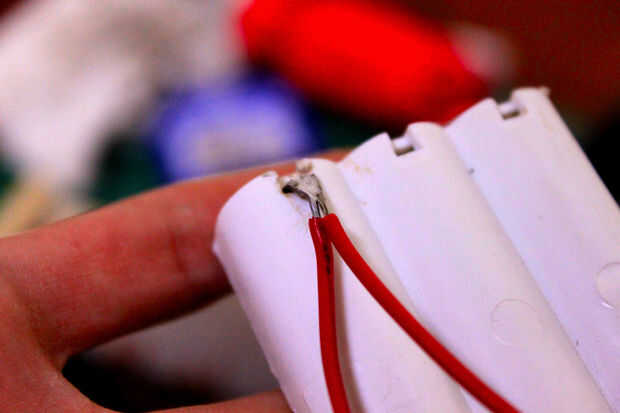 Usar una batería que mantenga un mínimo de 3 pilas alcalinas AA y que tiene un conector Molex de C-Grid. Con los extremos del circuito rojo 2 cables (los mismos que están conectados a las tiras de la cerveza), sujete a la batería de la parte inferior insertar "agujeros" y soldarlos juntos.