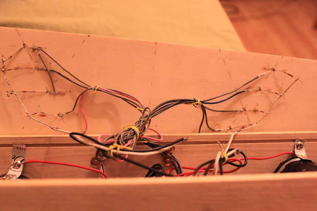 Circuito de fijación y soldadura cables a cada resistencias conectadas a los LED ' s en la tapa de la caja en ambos lados. Organizar los cables por envolverlos juntos, como se muestra en la imagen con una prohibición de amarillo. Con el alambre de niobio, soldar todas las resistencias en cada lado. En un extremo, los alambres del circuito blanco deben soldarse a la resistencia última de cada lado. El otro extremo del cable va soldado a la batería. En el mismo lado que la tira cerveza, prender los cables de circuito juntos al lado de la caja como se muestra en la imagen.