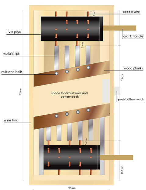 El proceso comienza con la caja de vino en el que ataremos tablones de madera con tiras de resorte del metal a los lados interiores. El alambre de cobre va clavado en el tubo de PVC que se asegurará al lado de la caja. El mango entonces se unirá a la tubería desde el exterior y como cada usuario lo convierte, el alambre de cobre se pego las tiras de metal y crear sonido. Los LED ' s reaccionan y encienden ya que los cables se conectarán a un circuito que está conectado.
