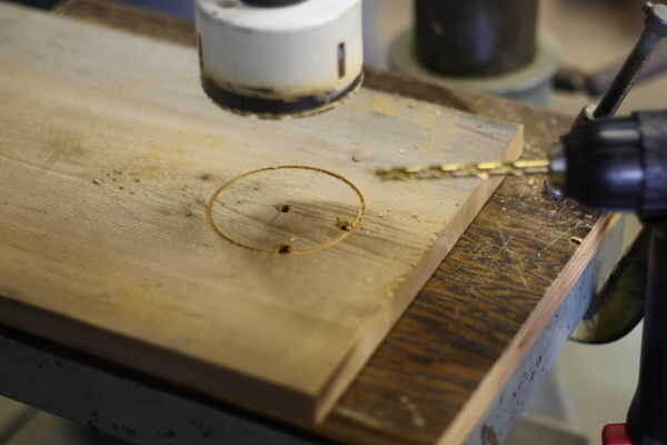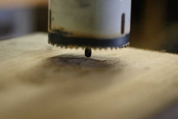 Tire la sierras de atrás hacia fuera, apague el taladro y con la marca de la sierra como guía, perfore unos 1/4" o similares tamaño agujeros a lo largo del interior de ese círculo. La idea es crear agujeros de salida de las virutas y serrín por el agujero vio escapar a. Esto reduce la fricción en la corte, lo que reduce las temperaturas y haciendo que el proceso vaya más suave. Después se perforan los agujeros, la pieza vuelva a colocar el taladro, verifique la alineación y enciende el taladro.