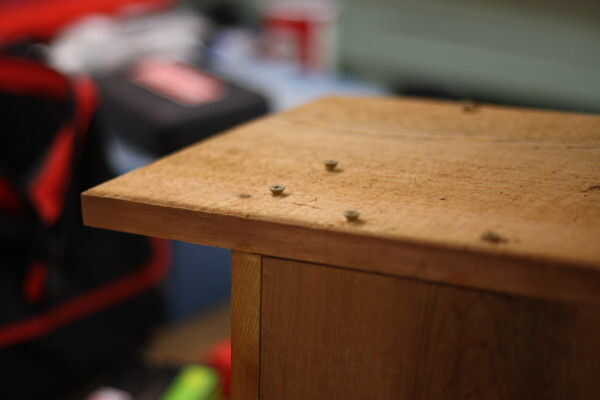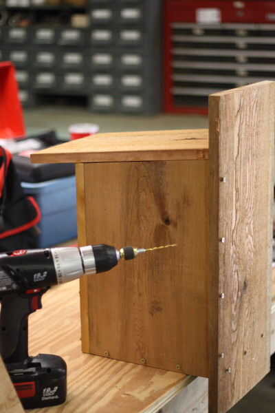 Ahora, establecer el cuadro vertical con la placa trasera del exceso sobre el borde de la superficie de trabajo para que se sienta a nivel sobre la pieza inferior. Coloque la pieza superior en su lugar, taladre agujeros guía en la parte superior en el frente y lado y fije. Flip en frente o que permanecer de pie, haga agujeros en apoyo a la parte superior (formando un ligero ángulo), y luego conecte.