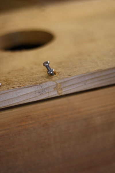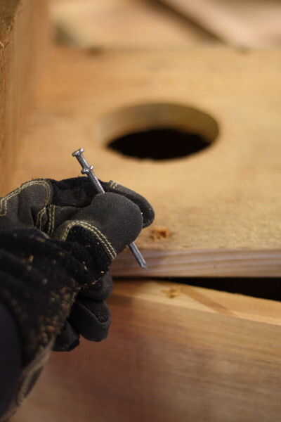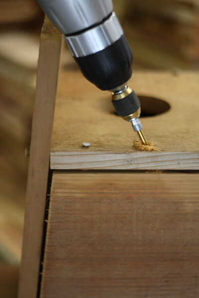 Hacer el agujero, agradable y profundo y luego deslice una de las uñas de dos caras en que sostiene la puerta cerrada. El agujero debe ser lo suficientemente grande como para que las uñas de dos caras pueden resbalar en y hacia fuera fácilmente. Su forma dos caras ayudan a evitar que el clavo sea absorbido por la madera por acción del viento, así como darle extra zona para agarrar al intentar gratis para el primer cheque de la temporada.