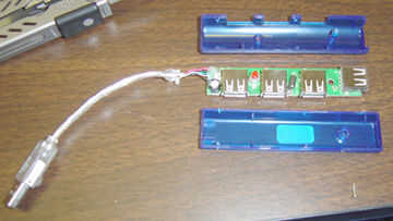 Hubo más de suficiente espacio para este hermoso pequeño viaje USB hub pero planeo agregar unidades en el futuro así que me tomo aparte ahora. Un tornillo y un poco apalancamiento de un cuchillo de la manía era todo llevó a abrirlo. En este modelo el PCB está claramente marcado por lo que esperan otra ' ible en una fecha posterior con respecto a la expansión.