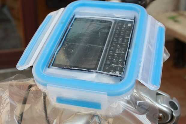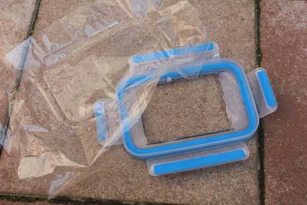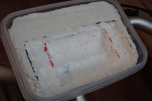 A continuación corté la ventana en la tapa de la caja de plástico con el bisturí. La ventana se corta de una manera que le permite alcanzar incluso el teclado y la pantalla entera. No se corta demasiado ancho para el teléfono móvil en el bloque de espuma de poliestireno.