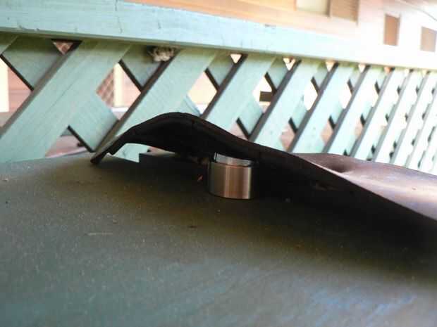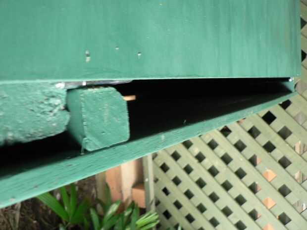 La primera foto muestra la brecha en la parte superior entre la pieza superior y la pared frontal de madera. Como esto necesita pivote superior entonces hacia adentro y hacia afuera para comenzar con, pliega la configuración de todo, no pude puse un trozo de madera sobre esto. Acabé usando poco desecho de caucho de un trazador de líneas de arranque viejo y jodido él abajo en un pedazo plano de madera para detener el agua y el clima en. Visible en la figura 2.