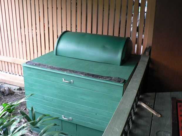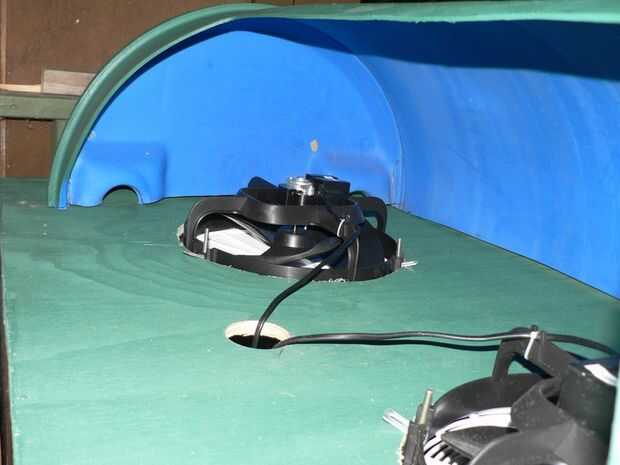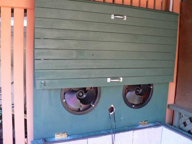 Cuadro 2 tiene también la impermeabilización del tiempo que para los fans, su mitad un barril de plástico que tenía ahí, pintados de color verde con un corte en la parte posterior que permiten la ventilación de los ventiladores. Esto debe dejar la mayor parte del tiempo de golpear los ventiladores y causando un montón de nastyness eléctrico! Cuadro 3 muestra la parte posterior de la misma. Su sesión justo en la parte superior para que éste puede ser halado para abrir la tapa, entonces volver en la parte superior fácilmente.