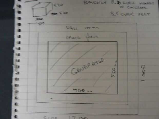 A continuación, mida el generador. Era 800 x 600 mm. Así que da un buen rectángulo fácil trabajar con. Esto dibujé como en papel, por lo que Id tiene las medidas a través de todo el camino. Después de calculó 100mm de la brecha entre el generador y la pared sonado como suficiente, pues agregó que y dibujó otra caja. Finalmente, después de un viaje rápido al lugar que hace bloques de hormigón, elegí un tipo de bloque que fue de 90mm de ancho. Así que agregué una caja final alrededor de eso. Lamentablemente parece que han lanzado este trozo de papel hacia fuera, así que imaginad tres casillas dibujados en un pedazo de papel con las dimensiones pulg. garabatos que estas dimensiones varían dependiendo del tamaño de ladrillos que usted elija y el tamaño de su generador.