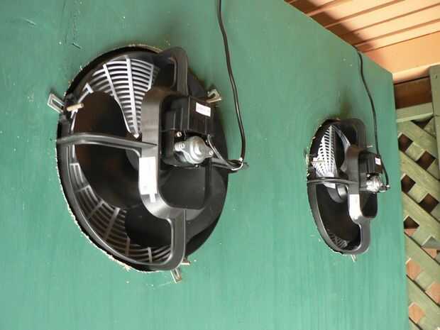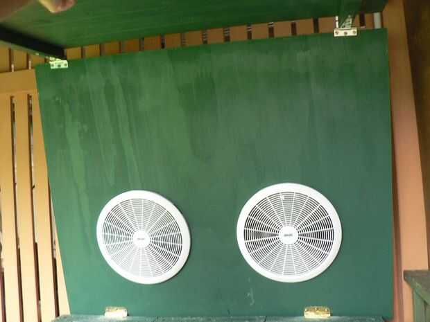 En la parte superior, le puse dos ventiladores de baño para proporcionar la succión en la teoría de que el calor se levanta, creando un flujo positivo de aire, entrando en la parte inferior y salir de la parte superior. Para poner en, trazada en la parte superior de un cubo que coincidió perfectamente con las dimensiones de los ventiladores, luego recortar con una sierra de calar. Luego corté un agujero con un forstner bit junto a ellos lo suficientemente grande para los cables de alimentación a través de la gota dentro de la caja y en el tiempo.