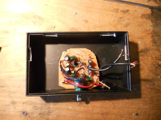 Los altavoces y el PCB acaba de ocurrir caber en la caja casi exactamente en el alto y ancho, así que organicé de manera que queda tanto espacio como sea posible para las baterías. La caja tenía un revestimiento interno de cartón que quité. Taladrar un orificio de la perilla de volumen y asomó un pequeño agujero para el indicador LED azul brillar a través. Los altavoces no bastante mentiría al ras con la parte inferior de la caja, así que corte a algunos de lo exceso PCB para que encajen.