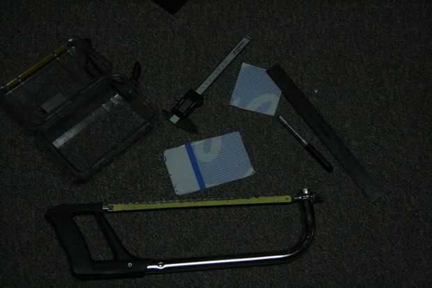 Luego cortar la placa para hacerla ~ 20mm más corto que el original, en este punto el apoyo de parte de CF se corta en la parte inferior de acuerdo con la restricción de altura de la base de ~ 14mm, las dos piezas entonces se consolidó junto con un pequeño poyo para el refuerzo.