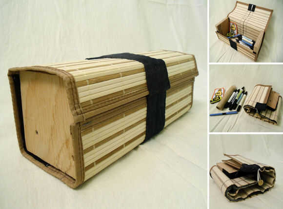 Este cuadro utiliza un mantel de bambú como la cáscara externa rígida, con restos de madera para los lados. El cuadro conserva su forma con el uso de sujetadores de gancho y lazo (Velcro) a lo largo de los lados, que permiten también la caja para ser derrumbada cuando no esté en uso.