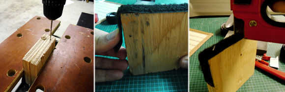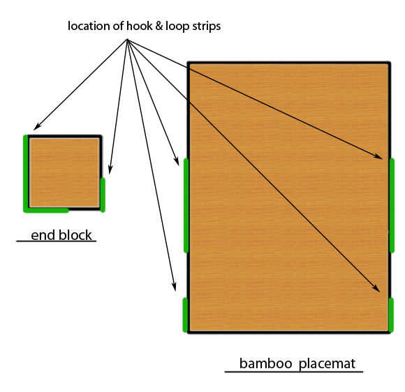 Las tiras utilicé tenían un forro adhesivo, pero que no será suficiente para mantener unida a la superficie de la madera y el bambú. Utilizando una engrampadora para las tiras de lazo fueron Unidas a los bloques de extremo, y las tiras de gancho fueron atadas a la parte inferior de la estera de bambú con hilo fuerte.