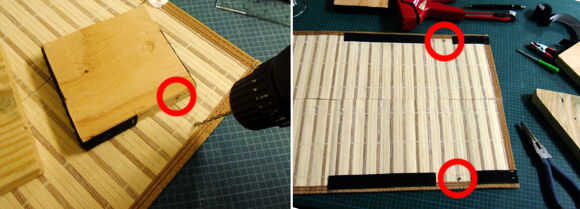 Antes de taladrar, pruebe la colocación de sus piezas y la ubicación de los sujetadores del gancho y del lazo. Medir donde están los orificios a taladrar, luego doble check. Usando una broca de 3mm [1/8"], taladre un orificio guía a través del mantel y taladre unos 12mm [1/2"] en cada bloque.