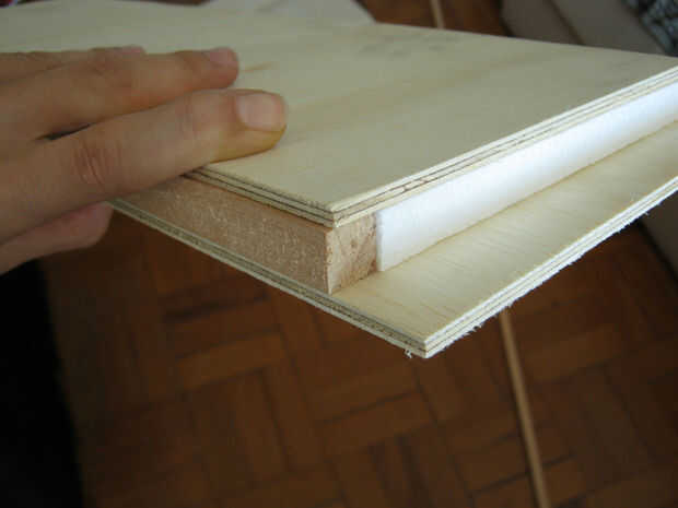 Para el EPS (poliestireno) del pegamento a la madera contrachapada usé un pegamento de contacto especial que no ataque/derretirlo. Pegamento PVA puede utilizarse también (y es más fácil trabajar por cierto), pero tienes que encontrar una manera de mantenerlo presionado hasta que se seque (aproximadamente 3 horas), y tarda más en tener todo montado (un martirio para personas ansiosas). Yo también he empleado 1, 5cm cuadrado perfiles para mejorar la rigidez en los perímetros de la ensambladura de madera.