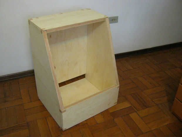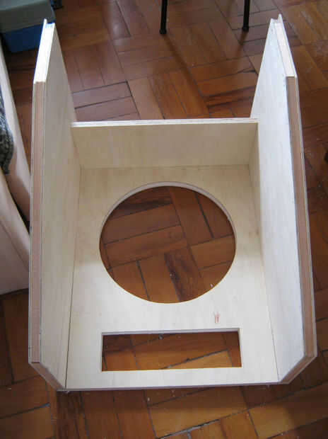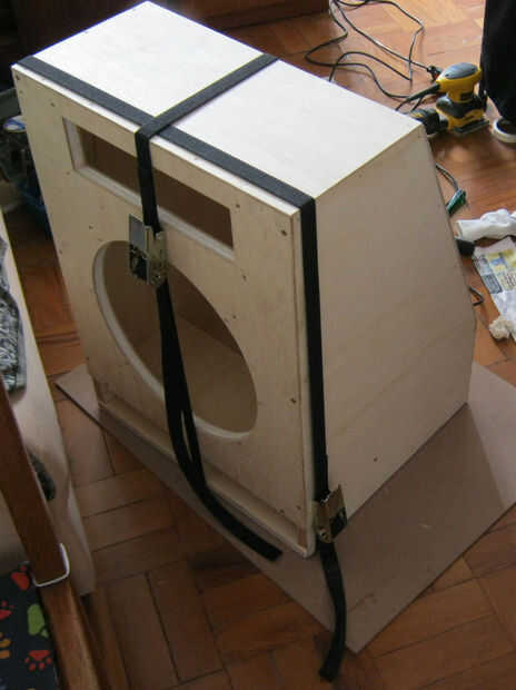 Una vez que el listo de EPS-contrachapada de paneles sandwich, instale la caja usando cinta para comprobar las conexiones y recortar el exceso de material hasta que encajen bien. Corte los orificios para el cuerno y el woofer. Montar las piezas definitivamente con adhesivo PVA, clavos y tornillos que encuentran necesarios. Predije una correa de trinquete de nylon para fijar rápido la caja para el remolque de bicicleta, que puede utilizarse también para mantenerla apretada mientras el pegamento seca.