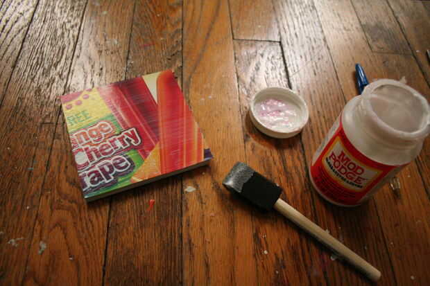 Ahora, agarra tu cepillo de esponja y una baldosa cerámica y cepillo en algunos Mod Podge en la parte superior. Entonces lugar la Plaza y capa en otra ronda de Mod Podge en la parte superior para sellar. Déjelo secar.