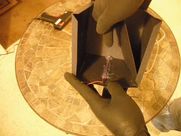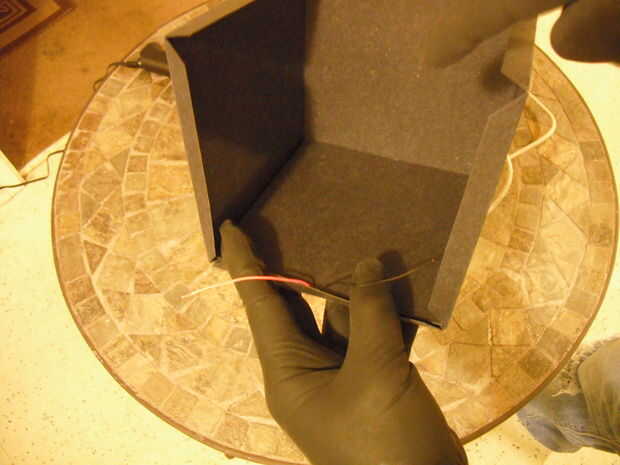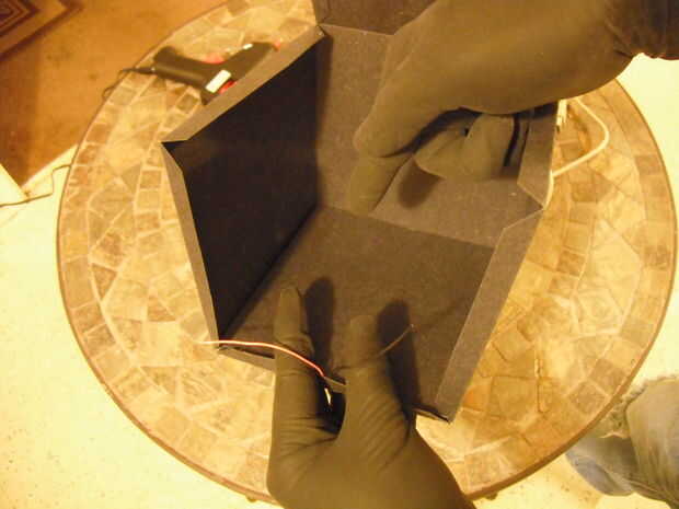 Ok recuerda la Plaza cortamos en el paso 3? ¿El dijo que mantener? Bien vamos a pegamento caliente esta en la parte inferior de la caja para cubrir los cables y el cable. Volver a utilizar el pegamento generosamente. ¡Hasta ahora, bien!