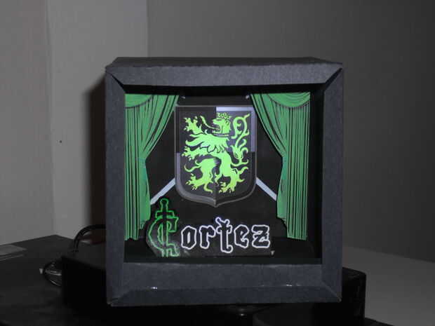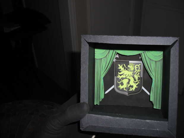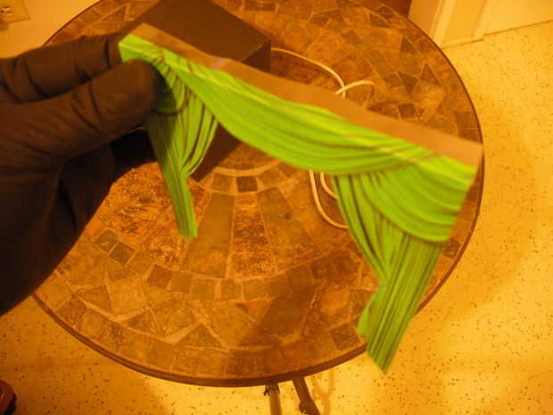 Coge tus tijeras y cortar las cortinas. Doble la parte superior de las cortinas para crear un colgajo. Aplicar cinta adhesiva transparente a esta aleta o se puede utilizar pegamento. Luego cinta adhesiva en la parte superior de la caja. No quiero las cortinas demasiado cerca al fondo de la cinta porque desea que la ilusión de profundidad. Lo mismo para el nombre pero en lugar de doblar a crear un triángulo pequeño con un trozo de papel y cinta adhesiva o pegamento a la parte inferior de la caja.