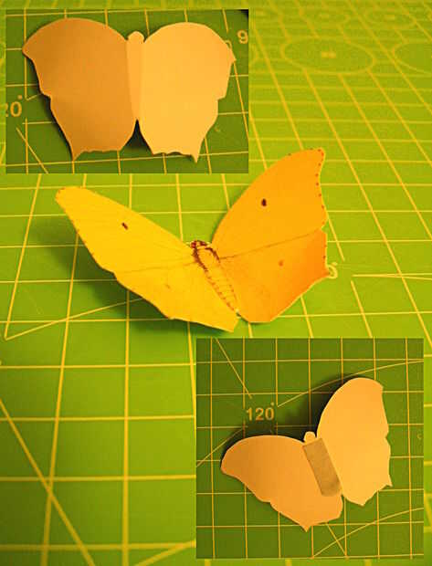 Prepare la mariposa cuidadosamente formando sus alas y plegable hacia arriba. Poner la cinta de doble cara en su espalda, pero deje la película de protección, así que tu amigo puede sujetar la mariposa.